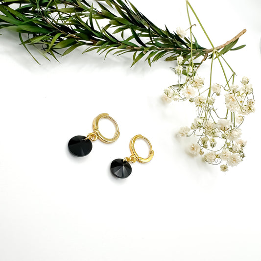 Here N There Crystal Hoops – Everyday Minimalist Earrings (Jet Black & Gold)