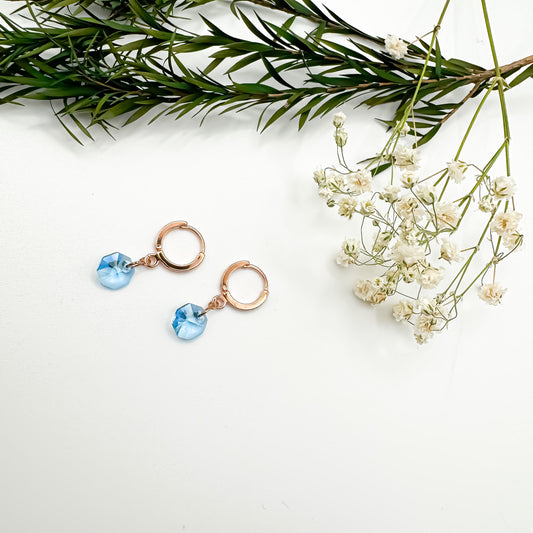 Here N There Crystal Hoops – Everyday Minimalist Earrings (Aquamarine & Rose Gold)