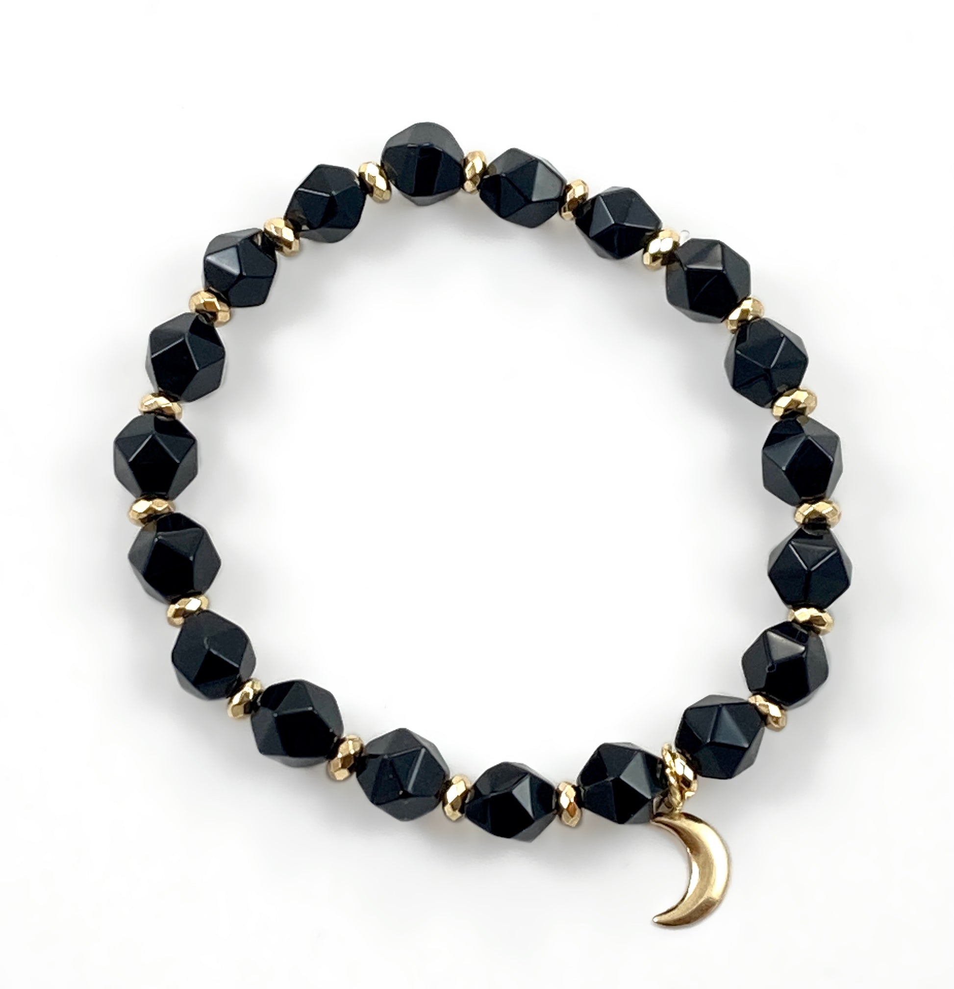 Starcut faceted Black Onyx with 14kt gold moon charm. Please note the gold spacers are smooth, not faceted.